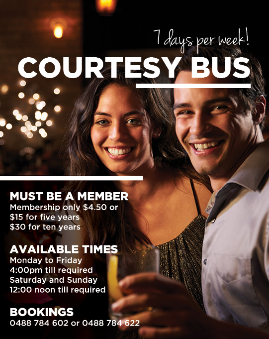 Our courtesy bus runs from Monday to Friday from 4:00pm and Saturday and Sunday from 12:00 noon till last call.